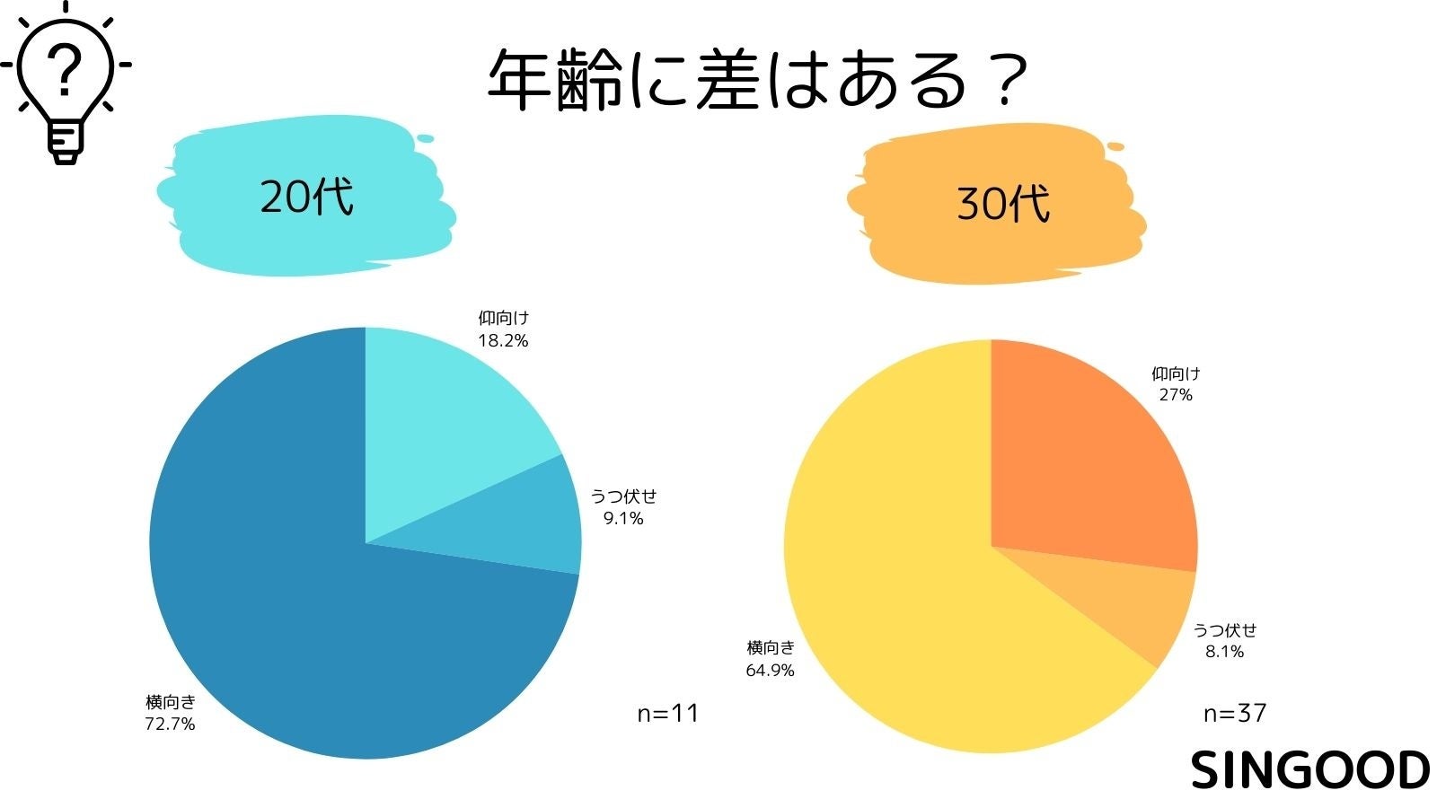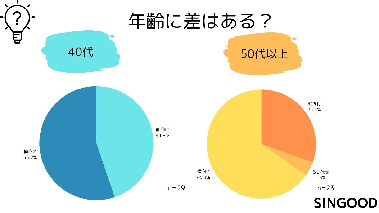 年齢別にまとめてみると、20代は横向き寝が多く、40代は横向き寝と仰向けの差が少ない結果となりました。