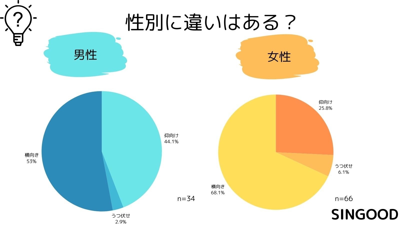それぞれの姿勢で男女差はありませんが、男性は横向き寝と仰向けで寝る姿勢がそこまで差が開かない結果となりました。一方女性は仰向けで寝る方が圧倒的に多い結果となりました。