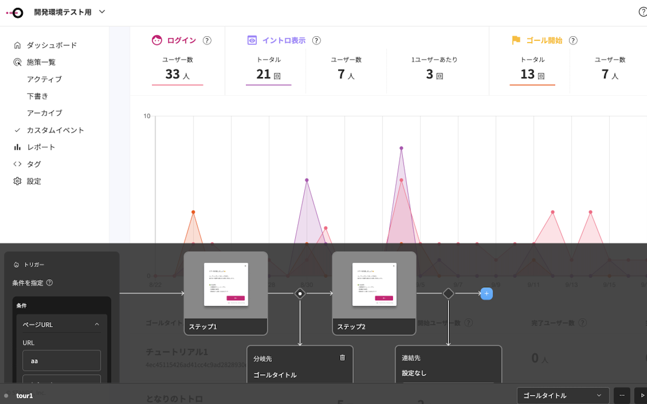 今回のリニューアルでは、ガイドの流れをよりビジュアルでわかりやすく表現し、全体を俯瞰しやすいようにレイアウトを変更しました。作ったチュートリアルの内容は、サムネイルとともに流れに沿ってわかりやすく表示され、条件による分岐などの詳細設定も直感的に確認可能です。