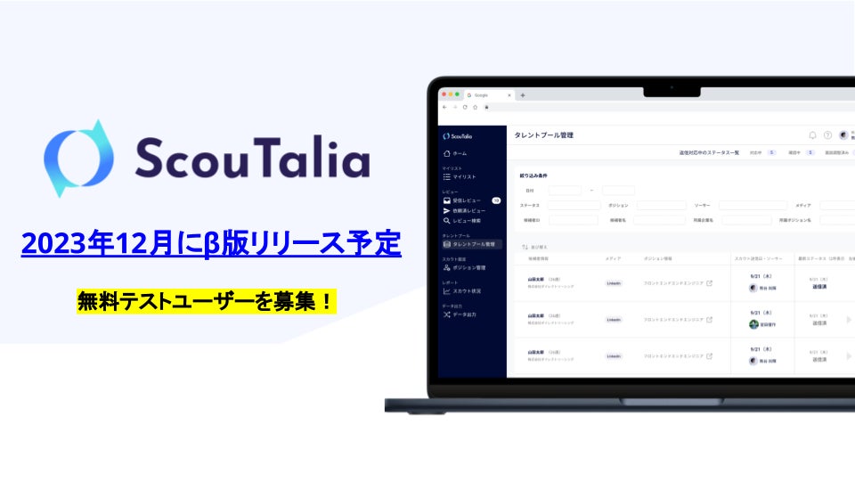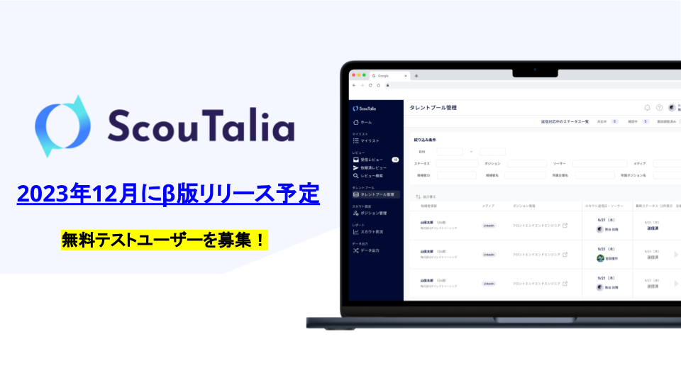 株式会社ダイレクトソーシング(代表取締役:竹村朋晃、本社:東京都港区)は、2023年12月より、ダイレクトリクルーティング専用のタレントプール構築ツール「ScouTalia(スカウタリア)」のβ版(無料)の提供を開始いたします。