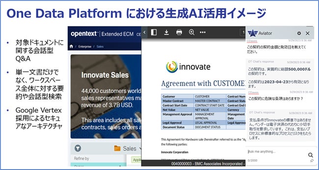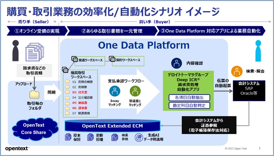 オープンテキスト株式会社(本社:東京都千代田区、代表取締役社長:三浦デニース、以下OpenText)は、調達・購買向け取引自動・効率化ソリューション「Bill. AI for One Data Platform」を発表しました。同ソリューションは、デロイト トーマツ グループのデロイト トーマツ リスクアドバイザリー合同会社(以下 デロイト トーマツ)との契約書・請求書などの電子データ管理の業務変革に向けた協業の一環で開発され、請求書の受領から支払い、電子帳簿保存法(電帳法)へ対応した管理など請求書に関わる業務プロセスを効率化するとともに、より高いガバナンス体制を構築することができます。また、オープンテキストの情報管理プラットフォームである「OpenText™ Extended ECM」で全社横断的に関連データを紐づけて管理することにより、生成AIを活用した文書の会話型検索や文書の自動要約および翻訳などが可能となり、データの利活用による業務の生産性と効率性を向上させます。