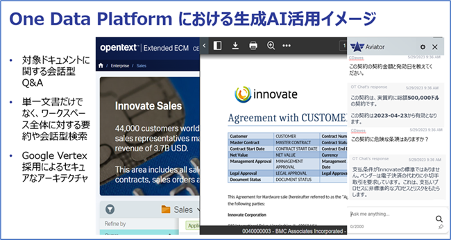 生成AI(LLM)とExtended ECMを統合することで、チャットベースの会話型検索で、さまざまな言語からなる大量のコンテンツから関連情報を素早く見つけることができます。また要約や翻訳を自動化することで、文書の理解や翻訳に費やす時間とリソースを削減しつつ、既存の知識や情報の再利用が可能となり、生産性、効率性を向上することができます。また、OpenText™ Extended ECMで文書データを横断的に管理することで、生成AIの学習用データが増え、ユーザーは、通常業務を遂行しながら生成AIのメリットを最大限に享受することができるようになります。たとえば、購買調達業務においてリース契約先を選定する場合に、過去のベンダー企業との各種膨大なリース契約書概要を短時間で比較し、最も戦略的な仕入れ先を選定することが可能になります。
