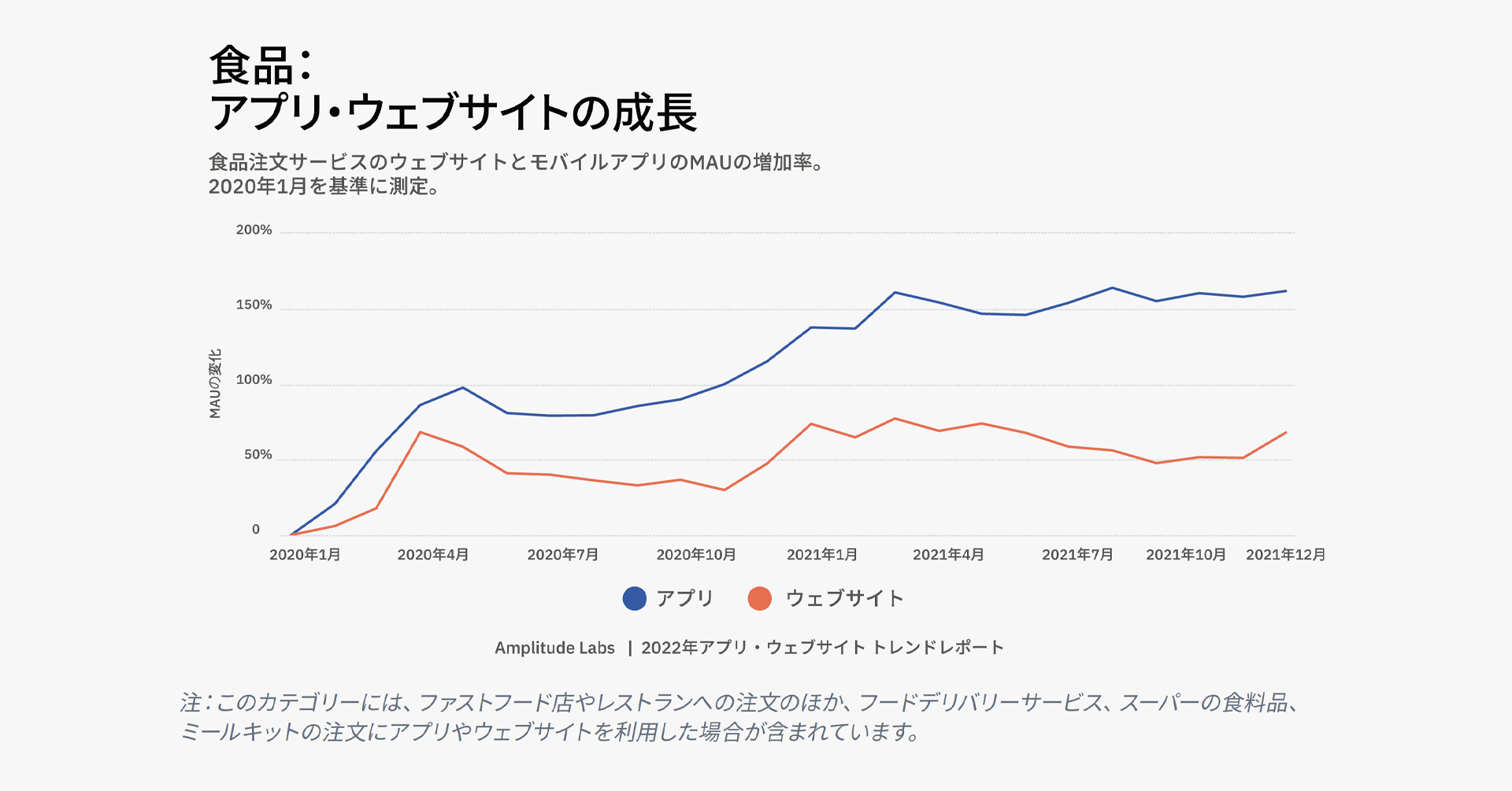 Amplitude, Inc. (本社所在地:米サンフランシスコ、CEO:Spenser Skates 以下、Amplitude)は、国別・業界別にアプリとウェブサイトの利用状況を紐解く「2022年 アプリ・ウェブサイト トレンドレポート」を発表しました。本レポートは、食品、金融、教育、ヘルスケア&ウェルネス、メディア・エンターテインメント、法人向け(B2B)SaaSなど、約1,600社が展開する数千のアプリとウェブサイトにおけるMAU(Monthly Active User:月間アクティブユーザー)の推移に着目し、国別・業界別でユーザー行動のトレンドを公開しています。