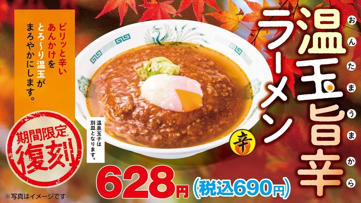 株式会社ハイデイ日高(本社:埼玉県さいたま市大宮区/代表取締役社長:青野敬成)は、創業50周年を記念して復刻「温玉旨辛ラーメン」を「熱烈中華食堂日高屋(以下、日高屋)」全店にて2023年10月13日より期間限定で販売開始いたします。