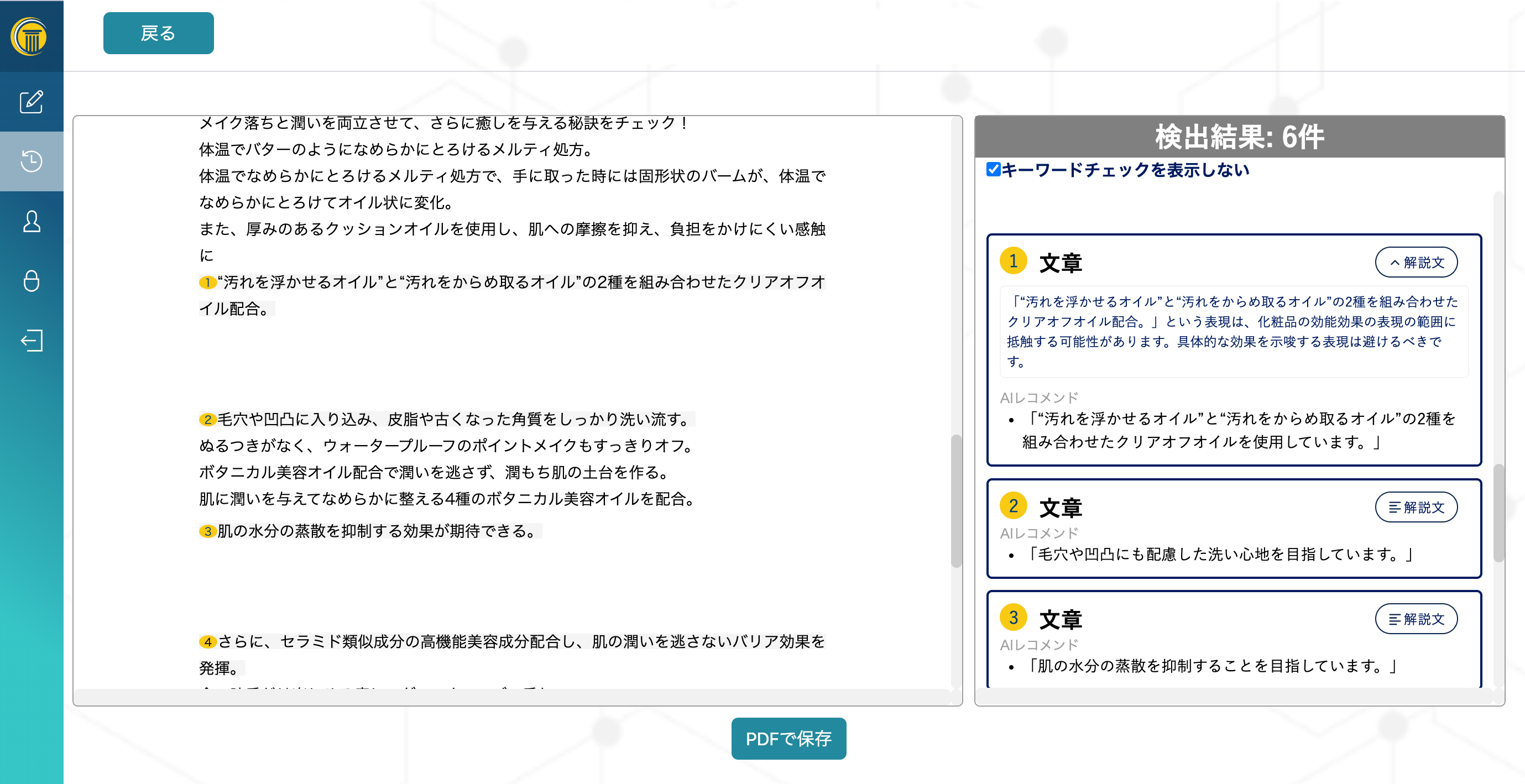 でも、広告チェックAIのサポートがあれば、誰でも簡単に薬機法チェックが可能になります。NGワードはもちろん、不適切な表現をすぐにピックアップし、安全な代替文も示してくれます。業務効率も上がり、生産性向上の助けになるでしょう。