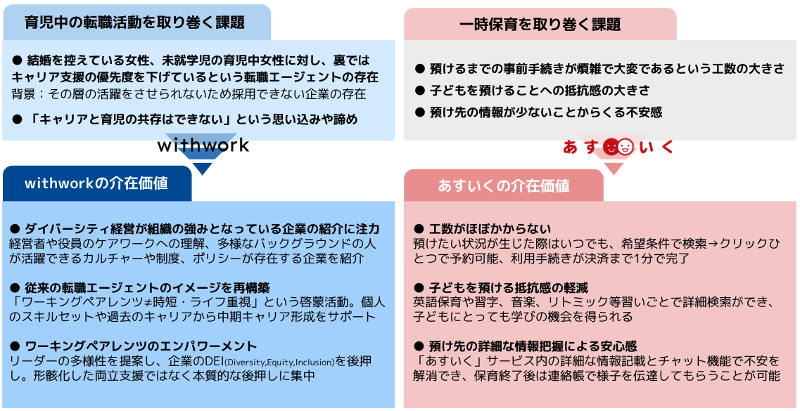 それぞれのテーマを取り巻く社会課題と各社提供サービスの介在価値を下記にまとめます。