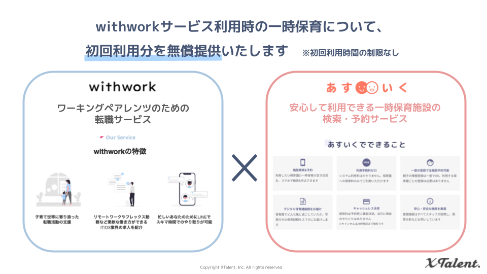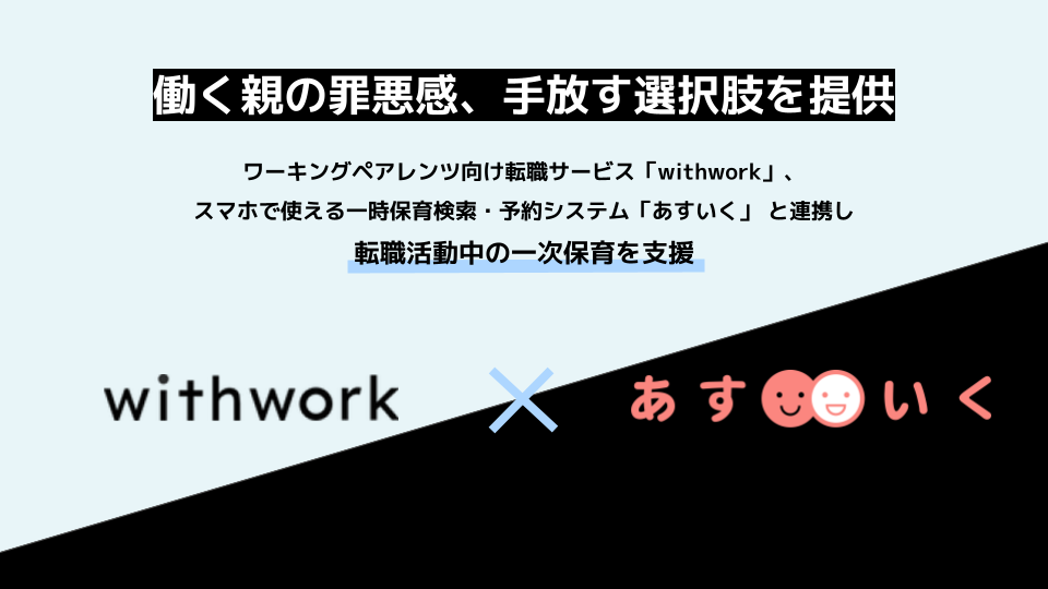 ワーキングペアレンツ向け転職サービス「withwork」、スマホで使える一時保育検索・予約システム「あすいく」と連携し、転職活動中の一次保育を支援