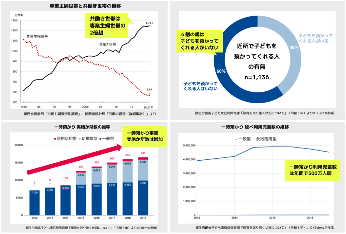 一方、個人の状況としては、働く母親が子どもや夫に抱く罪悪感「マミーギルト」や在宅勤務状況下で働く親が子どもに抱く罪悪感「在宅勤務ギルト」といった言葉が近日話題にあがっています。共働き世帯が専業主婦世帯の2倍以上となり、一時預かり事業か所数が増加する中で、新型コロナウイルスによる緊急事態宣言を受けて、保育園や放課後児童クラブでも休業や登園自粛の動きが広がりました。子どもの世話で仕事を休む保護者の休業補償のために政府が新設した助成金・支援金等もありましたが、在宅勤務をしながら自宅保育を行うワーキングペアレンツが増加するなど、就業・育児環境には大きな変化が起こっています。