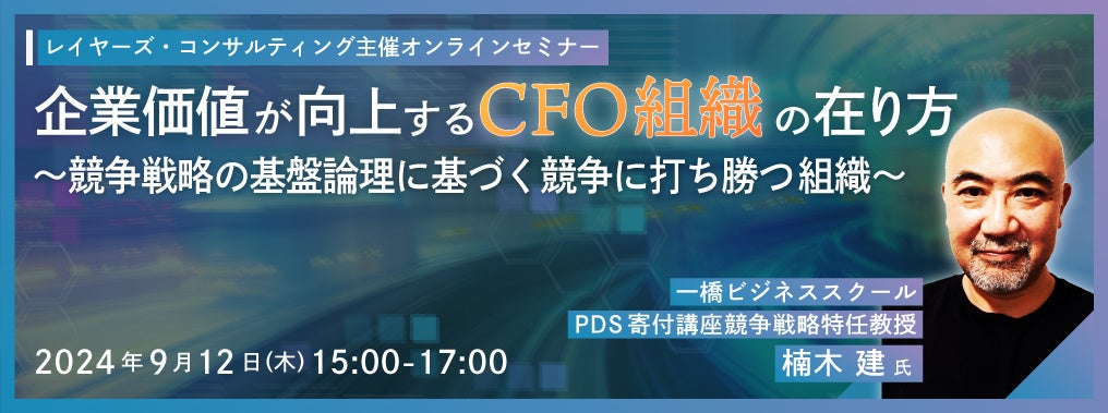 株式会社レイヤーズ・コンサルティング(東京都品川区、代表取締役CEO:杉野 尚志、以下:レイヤーズ)は、オンラインセミナー『企業価値が向上するCFO組織の在り方 ~競争戦略の基盤論理に基づく競争に打ち勝つ組織~』を2024年9月12日(木)に開催することを発表いたします。