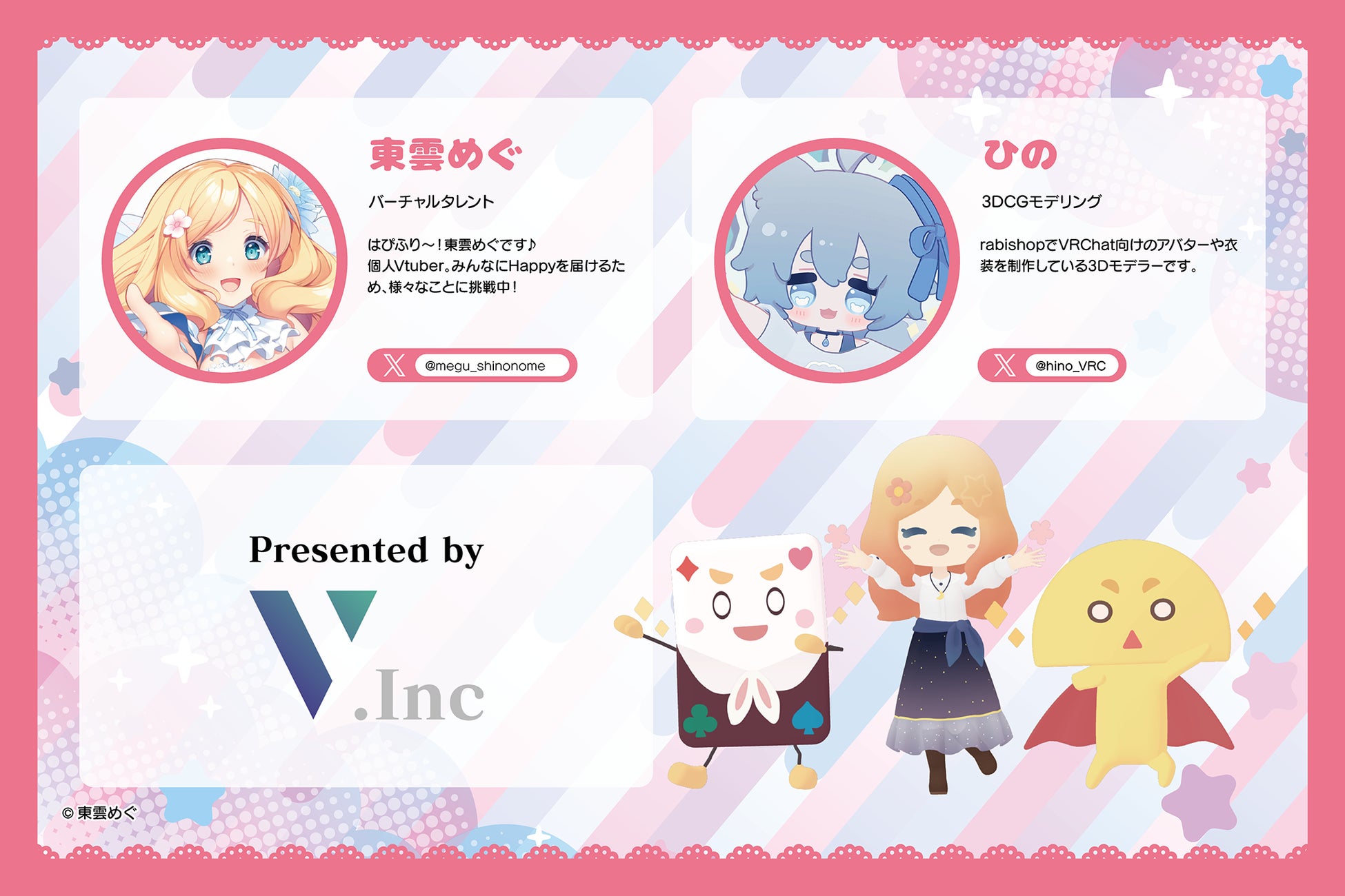 今回の取り組みは、そんな東雲めぐさんの「ファンの方との交流をもっと楽しみたい」そして「ファンの方同士のつながりを生み出したい」という想い伺って、Vとしても、VTuberとファンのより良いVRChat上でのコミュニケーションの形を考えていたことでコラボが実現。今回Vは、企画からアバターの制作まで、総合的にプロデュースさせていただきました。