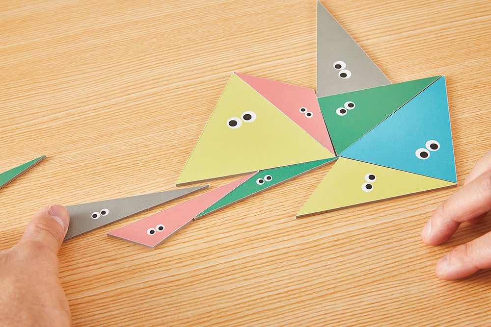 角度をテーマにしたこの作品は15℃ずつ変化している三角形タイル(通称:ピタカックン)を並べて360℃を作れたプレイヤーの勝利です。