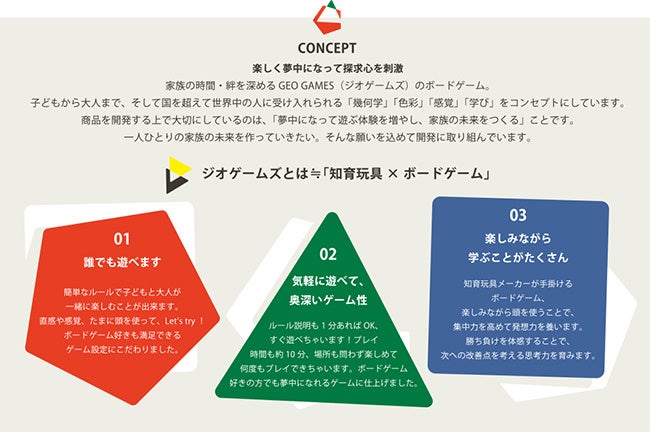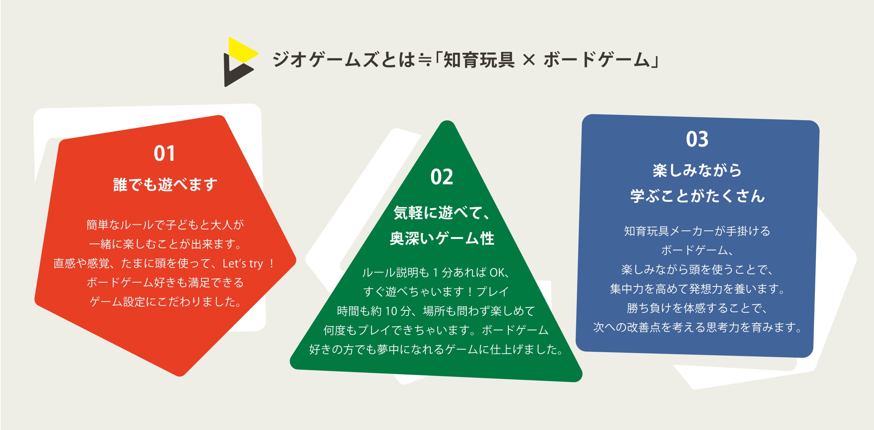 ボードゲーム×知育玩具をコンセプトに、子どもから大人まで、ファミリーからボードゲーム好きの大人まで楽しめる作品を5タイトルリリースします。