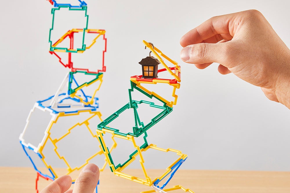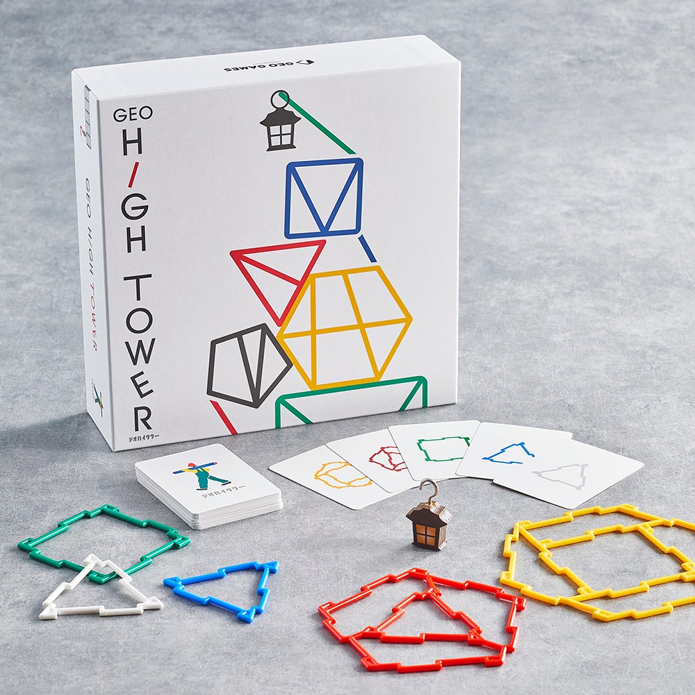 創造力と構成力をテーマにしたこの作品は知育玩具ジオフィクスを使ったボードゲームです。使う建築材料は三角・四角・五角・六角、様々な形をした建築材料を使ってできるだけ高い塔を作り上げ、一番高い所に灯りをともせた人の勝利です。