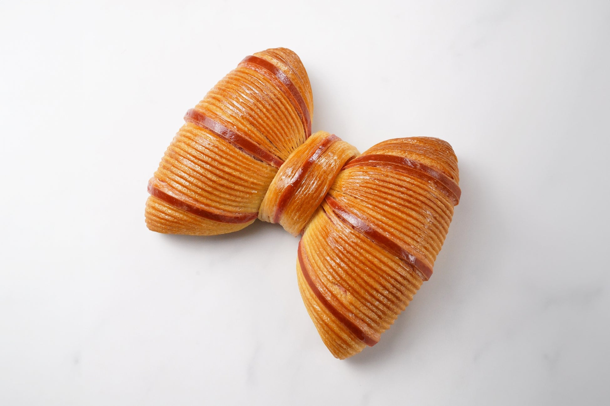商品説明:リボン型に成形したクロワッサン生地にキャラメルショコラクリームをたっぷりと絞りました。