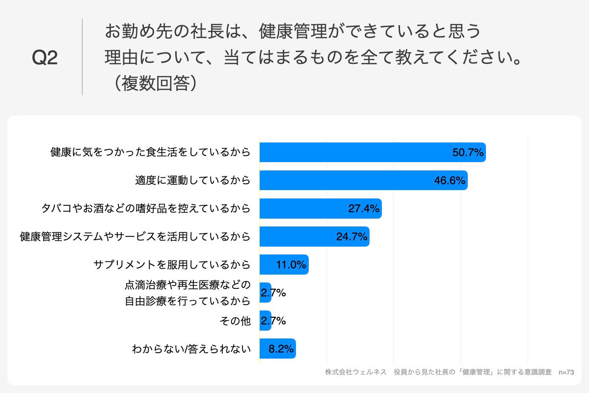 Q1で「非常にそう思う」「ややそう思う」と回答した方に、「Q2.お勤め先の社長は、健康管理ができていると思う理由について、当てはまるものを全て教えてください。(複数回答)」(n=73)と質問したところ、「健康に気をつかった食生活をしているから」が50.7%、「適度に運動しているから」が46.6%、「タバコやお酒などの嗜好品を控えているから」が27.4%という回答となりました。