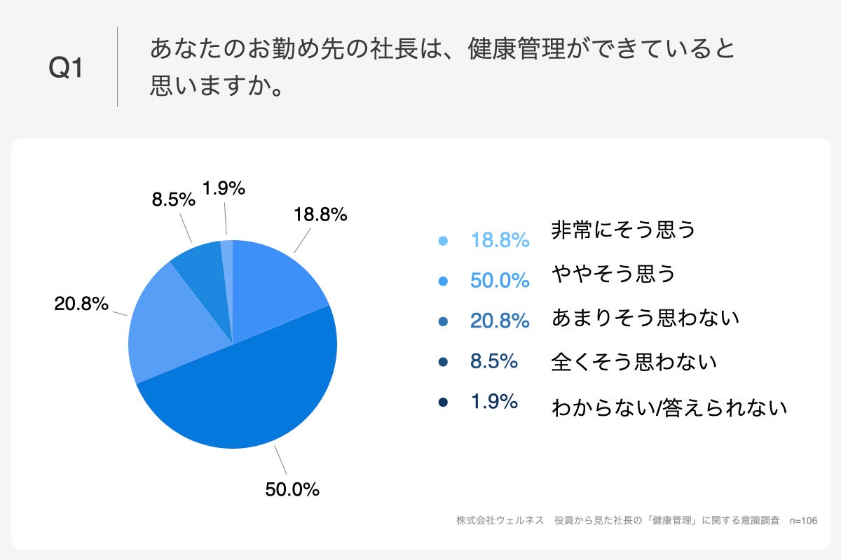 「Q1.あなたのお勤め先の社長は、健康管理ができていると思いますか。」(n=106)と質問したところ、「非常にそう思う」が18.8%、「ややそう思う」が50.0%という回答となりました。