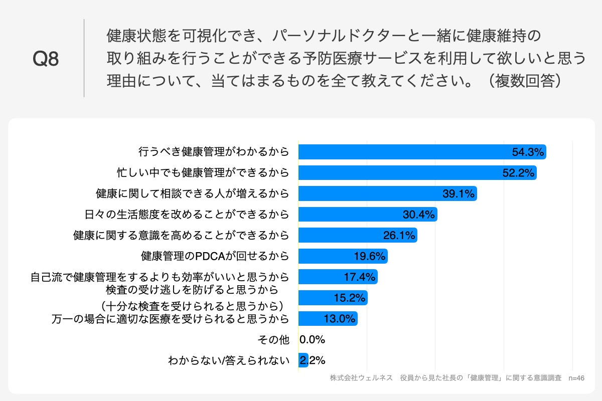 Q7で「非常にそう思う」「ややそう思う」と回答した方に、「Q8.健康状態を可視化でき、パーソナルドクターと一緒に健康維持の取り組みを行うことができる予防医療サービスを利用して欲しいと思う理由について、当てはまるものを全て教えてください。(複数回答)」(n=46)と質問したところ、「行うべき健康管理がわかるから」が54.3%、「忙しい中でも健康管理ができるから」が52.2%、「健康に関して相談できる人が増えるから」が39.1%という回答となりました。