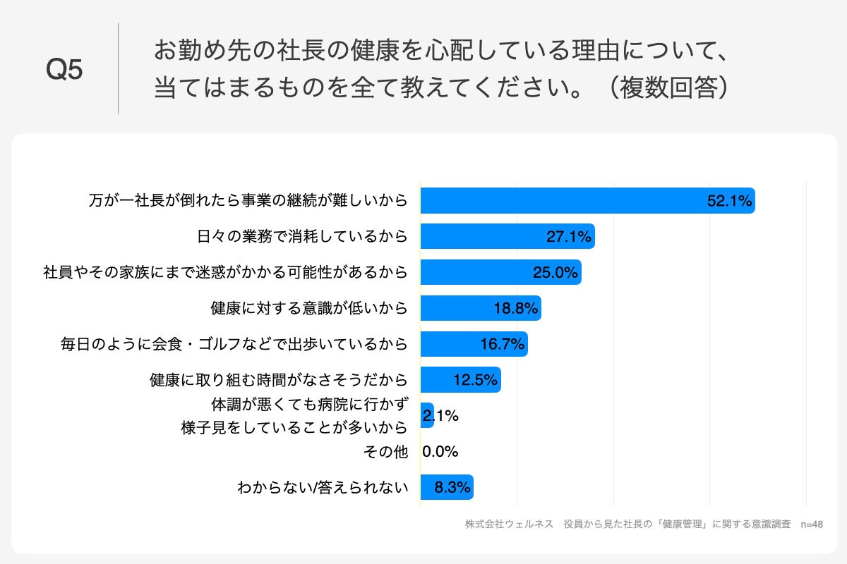 Q4で「非常に心配している」「やや心配している」と回答した方に、「Q5.お勤め先の社長の健康を心配している理由について、当てはまるものを全て教えてください。(複数回答)」(n=48)と質問したところ、「万が一社長が倒れたら事業の継続が難しいから」が52.1%、「日々の業務で消耗しているから」が27.1%、「社員やその家族にまで迷惑がかかる可能性があるから」が25.0%という回答となりました。