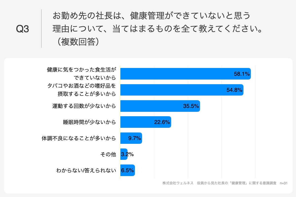 Q1で「あまりそう思わない」「全くそう思わない」と回答した方に、「Q3.お勤め先の社長は、健康管理ができていないと思う理由について、当てはまるものを全て教えてください。(複数回答)」(n=31)と質問したところ、「健康に気をつかった食生活ができていないから」が58.1%、「タバコやお酒などの嗜好品を摂取することが多いから」が54.8%、「運動する回数が少ないから」が35.5%という回答となりました。