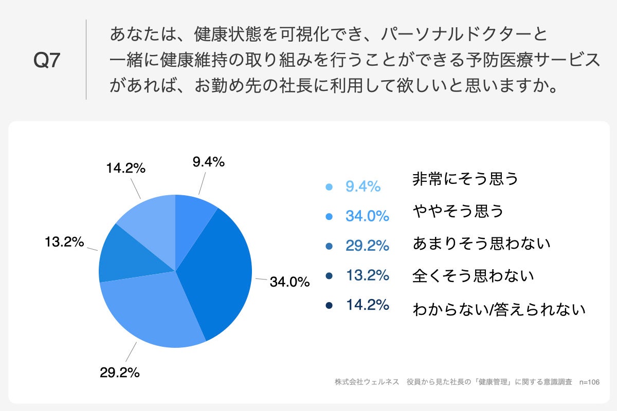 「Q7.あなたは、健康状態を可視化でき、パーソナルドクターと一緒に健康維持の取り組みを行うことができる予防医療サービスがあれば、お勤め先の社長に利用して欲しいと思いますか。」(n=106)と質問したところ、「非常にそう思う」が9.4%、「ややそう思う」が34.0%という回答となりました。