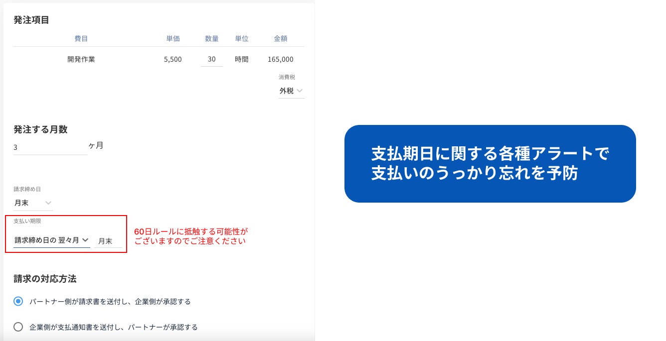 また、60日以内の支払いが遅れないための「支払期日アラート」で違反リスクを予防できます。
