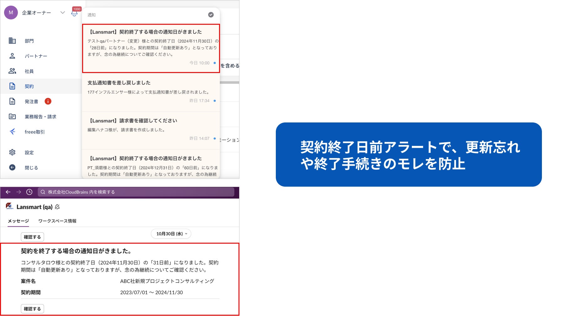 Lansmartでは、契約を終了する場合に事前通知日を予め設定しておけば、管理画面上・電子メール・Slack*にアラートが届くため、フリーランスとの契約継続について余裕をもったコミュニケーションができます。