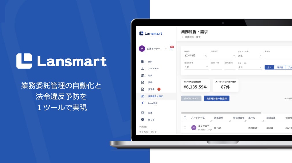 株式会社CloudBrains(東京都港区、代表取締役:眞壁雅彦)は、業務委託管理クラウド「Lansmart」において、2024年11月1日より施行されたフリーランス新法へ対応する新機能を発表いたします。