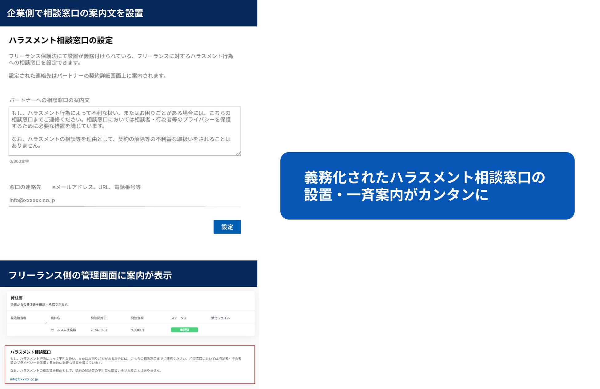 この機能をご利用いただくことで、フリーランスに対してハラスメント相談窓口を一斉に案内できます。