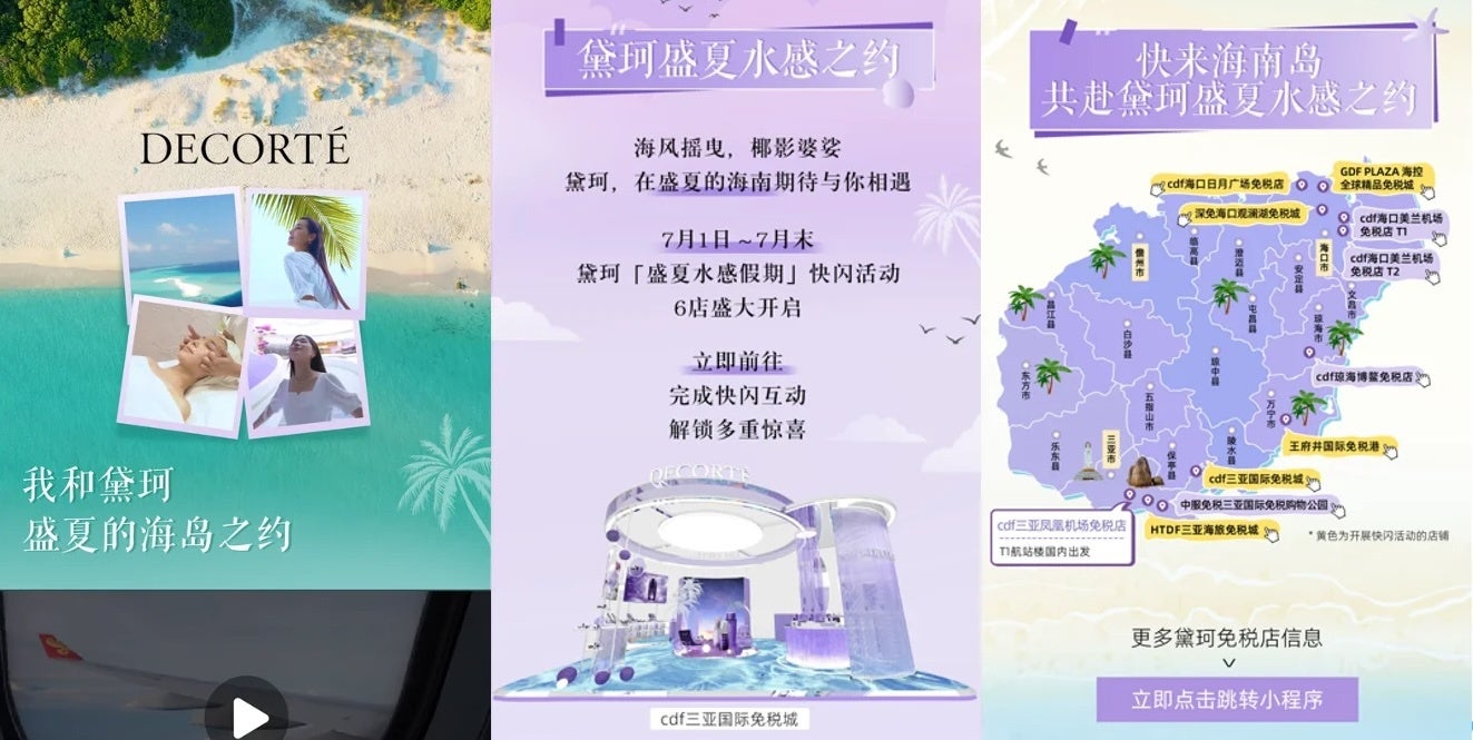株式会社コーセーより誕生した最高級の総合化粧品ブランドDECORTÉ(コスメデコルテ)にて、中国免税のプロモーションにおいて、旅マエ〜旅ナカのお取り組みをサポートいたしました。Trip.com Groupと中国国内SNS(微博、小紅書、微信)を活用し、旅マエ施策としてPR動画を展開。免税制度が利用でき「中国のハワイ」とも呼ばれる海南島全域の免税店で実施するポップアップイベントを、旅ナカ施策に向けたブランドの認知度向上及び販売促進施策としてサポートいたしました。