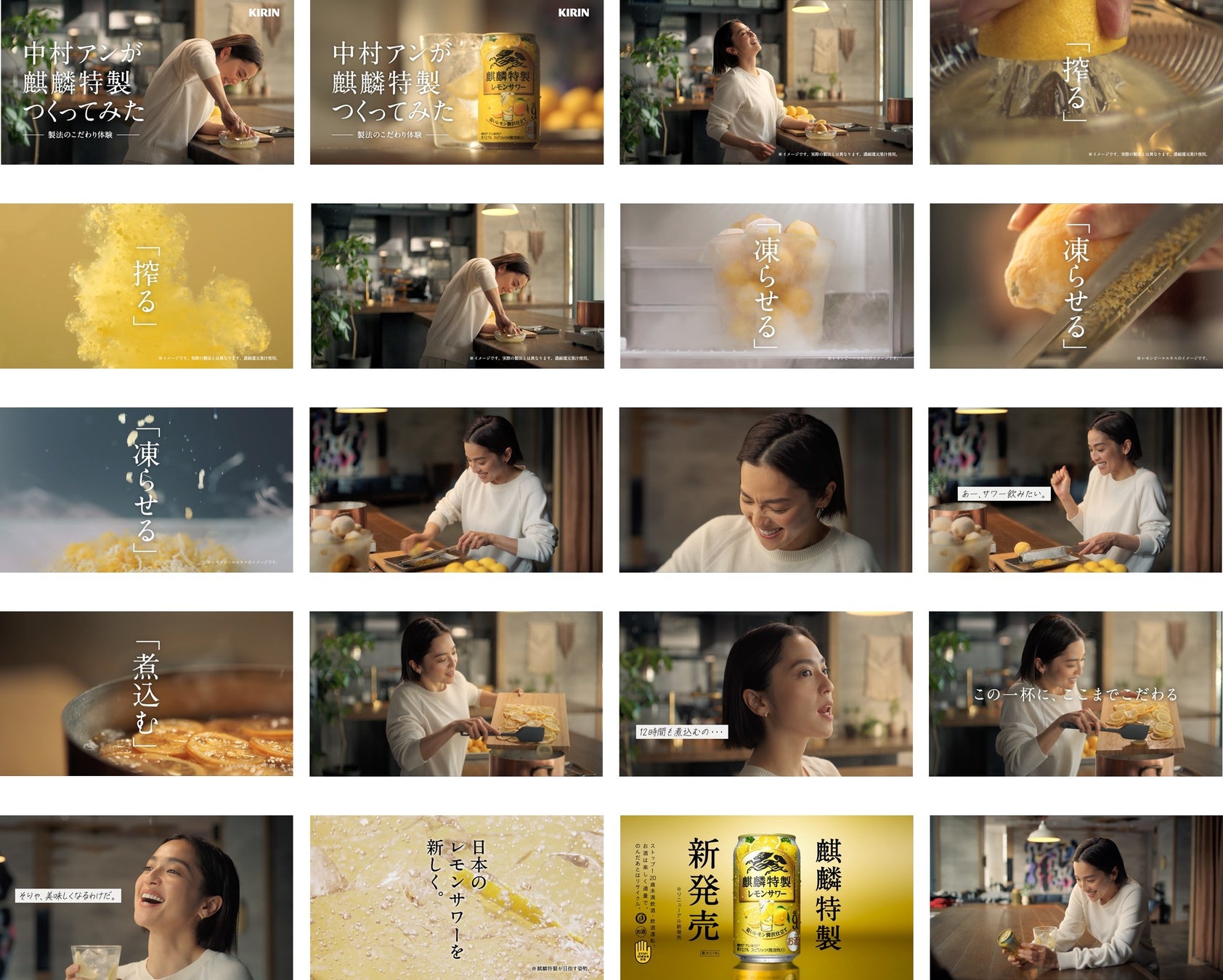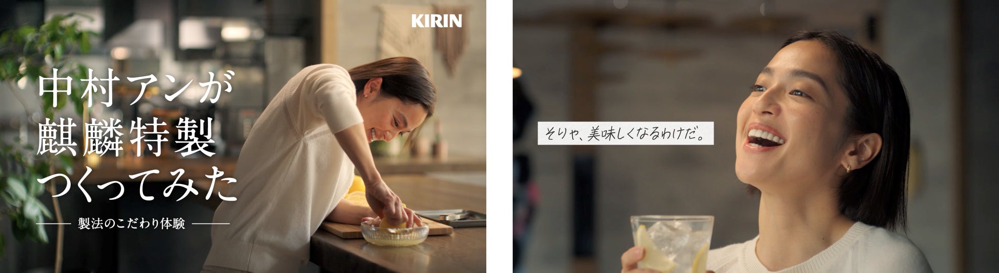 「中村アンが麒麟特製つくってみた篇」は、中村アンさんが出演。「日本のレモンサワーを、新しく。」というテーマを体現した、「麒麟特製」の手間を惜しまない丁寧なつくり方を体験するWEBムービーとなっています。中村さんは、レモンのおいしさを余すことなく引き出す製法のこだわりを1つずつ体験。「搾る」「凍らせる」「煮込む」といった、力のいる工程や時間のかかる工程を大変そうにこなしていく様子が見どころです。「麒麟特製」のこだわりを実体験した中村さんが「そりゃ、美味しくなるわけだ。」と感心しながら、「麒麟特製 レモンサワー」を飲む姿にも注目です。