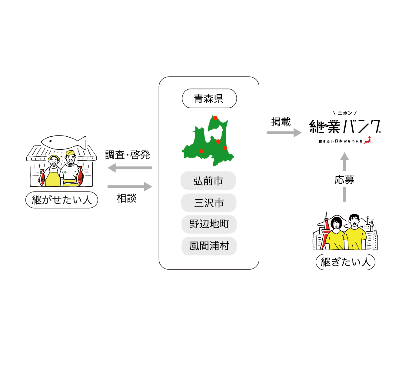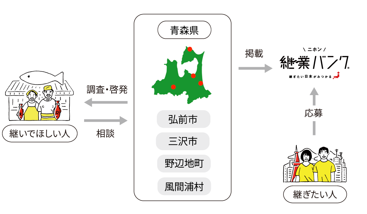 弘前市、三沢市、野辺地町、風間浦村の4市町村に「ニホン継業バンク」のノウハウとソリューションを提供。後継者不在の事業者と全国の継業希望者をマッチングし、青森県で事業承継の促進を図ります。