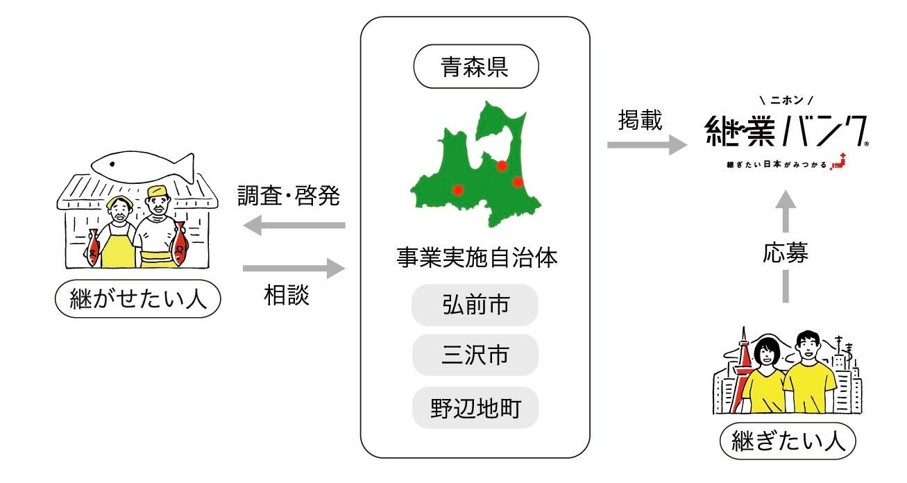 日本全国の地域に先行して経営者の高齢化が進む青森県において、事業承継に取り組む意欲のある3市町村を青森県が公募。採択された弘前市、三沢市、野辺地町に対し、25市町村への継業支援で培った「ニホン継業バンク」のノウハウとソリューションを提供します。また、別の委託事業として、風間浦村では地域連携DMO「しもきたTABIあしすと」と連携し、ニホン継業バンクを活用した事業承継支援を開始する予定です。