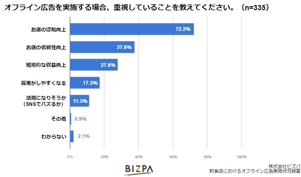 - オフライン広告実施において最も重視しているのは、「お店の認知向上」で72.2%。「話題になりそうか(SNSでバズるか)」も11.3%と一定数存在