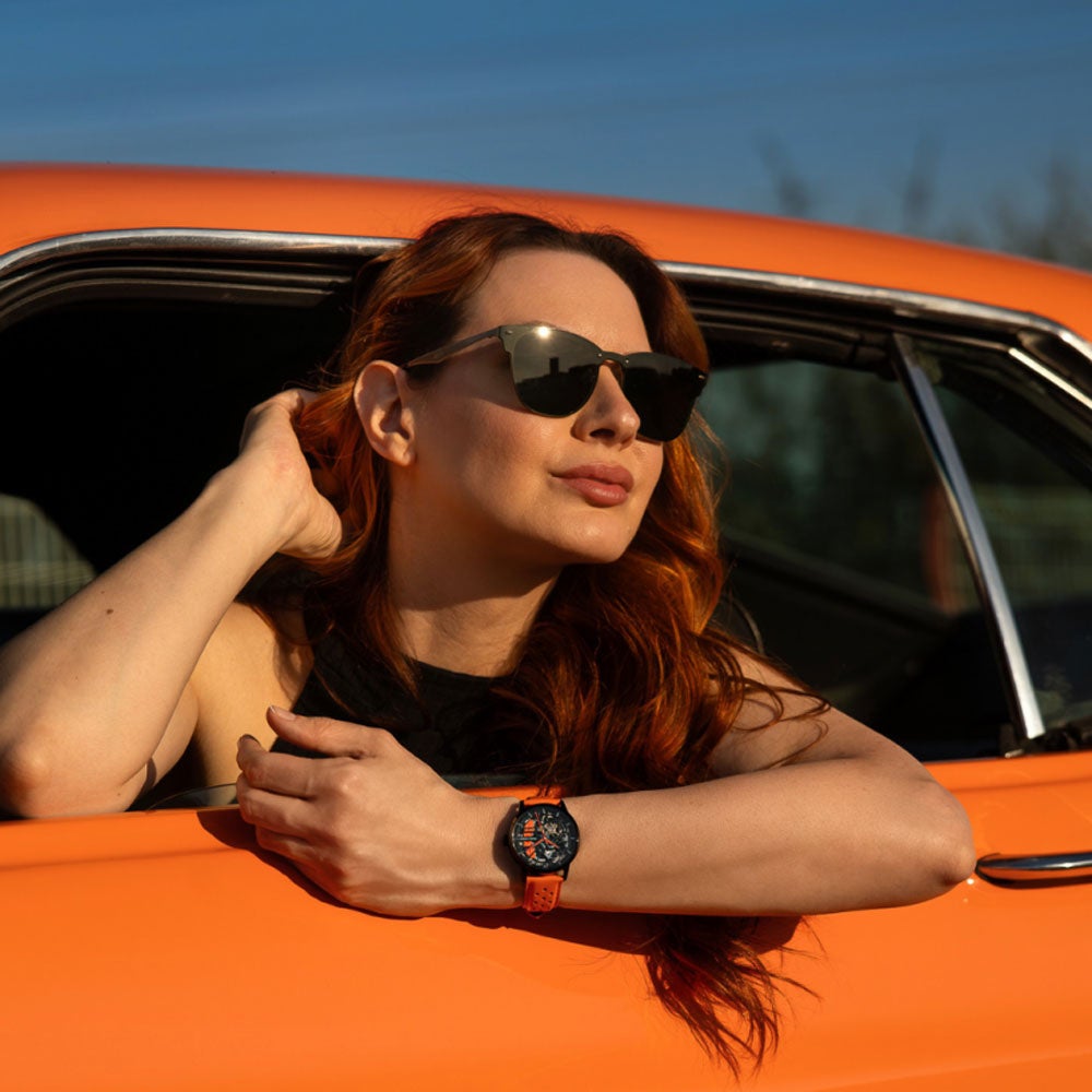 従来のメンズモデルで好評を博してきた、ブレーキキャリパーやホイールを思わせる立体感のあるダイヤル、そしてエンジンヘッドカバーを模したブランドロゴなど、細部にまでこだわったモータースポーツの世界観はそのまま。デザイン性・個性・自動巻きムーブメントの機能美が調和した、本格派ながら日常使いも叶う万能な1本に仕上げました。オンもオフも、スポーティな個性を楽しめます。
