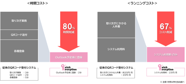 これにより受付業務にかかる時間を約80%、費用は約67%カットを実現することができます。