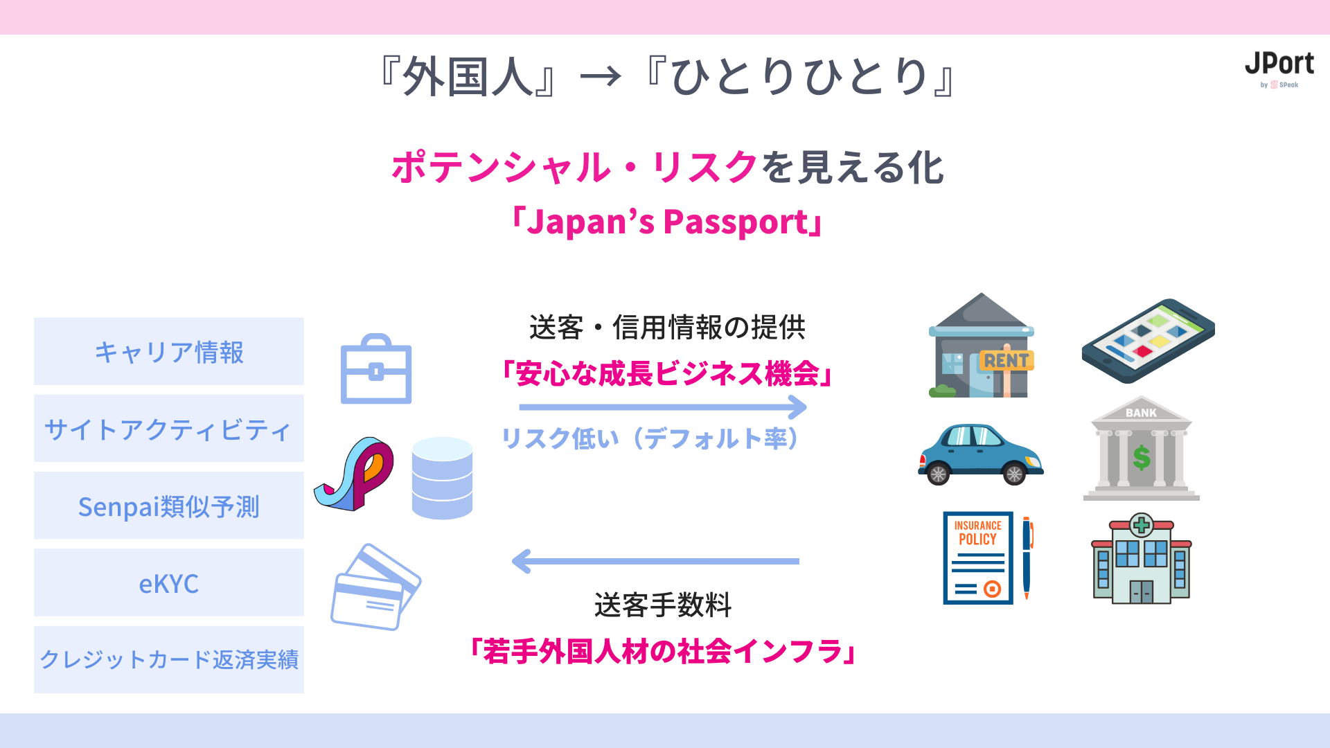 若手外国人材の日本でのキャリアを一番近くで支援していく中、企業規模を問わず先進的な企業の経営者や人事の方々に出会い、キャリアの課題解決の道筋は見えてきました。しかし、日本を「グローバル人材先進国」にするには、金融・住まいなどの社会インフラ分野でのインクルージョンが必須です。根底には、2つの原体験があります。まずは、Markとの約束。彼はマレーシア出身、米国トップ100大学卒業後、日本国内有名大学院に留学。就活の仕方に悪戦苦闘し自分に合わない企業に就職し、メンタルを壊し帰国しました。彼が帰国する一日前、キャリア・金融・住まいなどのいわゆる「社会インフラ」の部分で常に日本で構造的差別を感じたことを吐露してくれたことが頭から離れません。もう一つは、私の妻Lily。16歳で渡米した高校の同級生で外国人の妻と結婚し、日本で暮らして14年間で「外国人NG」は日常茶飯事。クレジットカード、賃貸、銀行口座、携帯など挙げ出したらキリがありません。そして、MarkもLilyも、氷山の一角なのです。日本が好きで、日本で学び・働き・暮らす若手外国人材は、既存の社会インフラでは「外国人」と区別され、負のスパイラルは繰り返されています。一方、市場縮小する日本で急増する若手外国人材市場を新たな消費者層としてサービス提供を狙う企業へ与信担保する存在が無いのが実態です。資金調達を終えた今、キャリア事業の拡大による雇用機会の創出、そして若手外国人材の日本でのパスポートとなる『JPort(Japan’s Passportの略)社会インフラ開発』による与信担保を確立し、日本を「グローバル人材先進国」にします。
