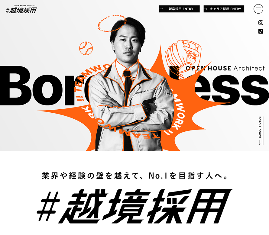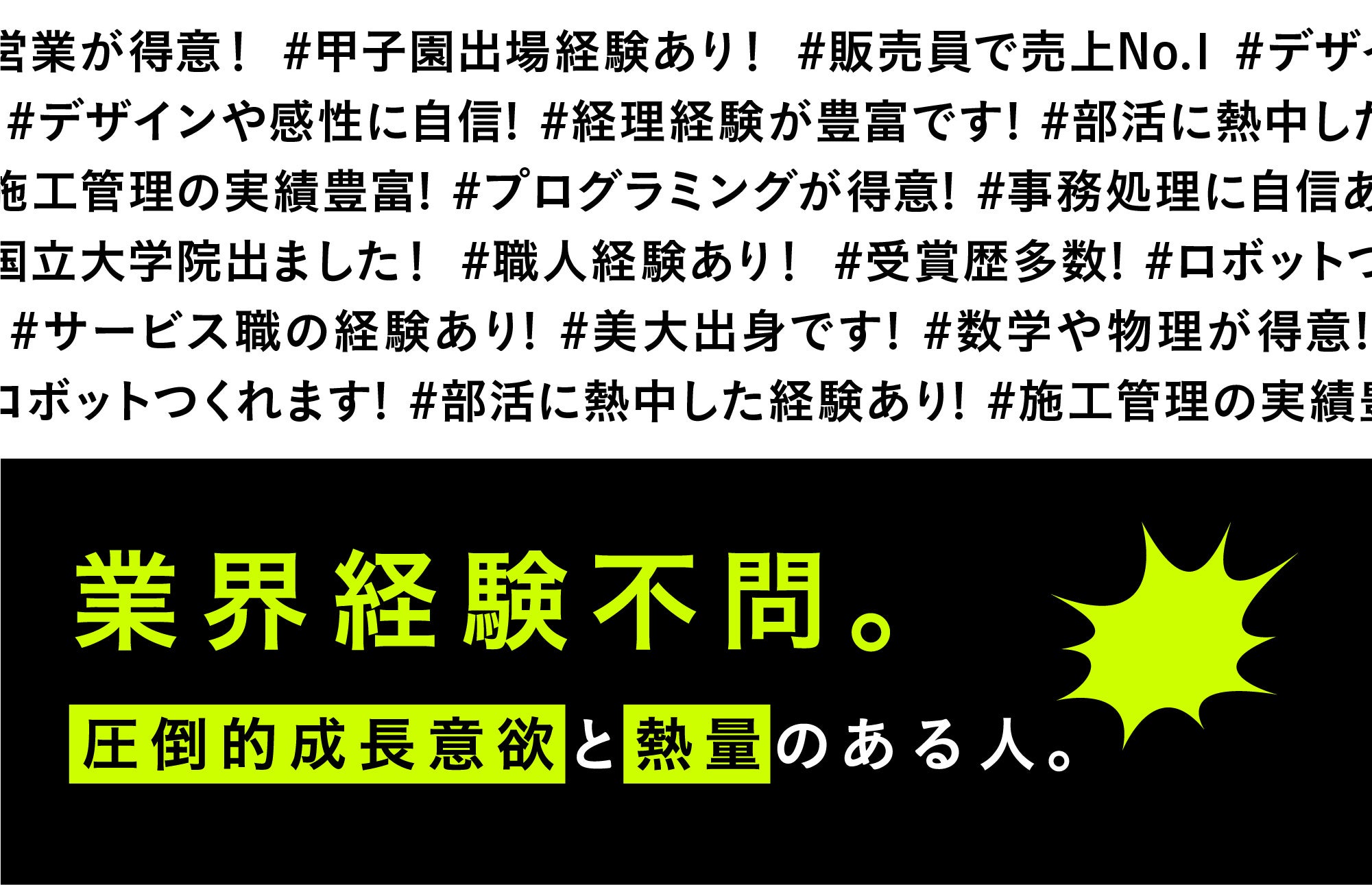 文系出身の方、理系出身の方、未経験の方、経験者の方、若手もベテランも関係なく、誰もが活躍できる組織づくりで、業界No.1の建築会社を目指しています。業界や経験の壁を「越境」して、No.1を目指す人に出会いたいと考えています。