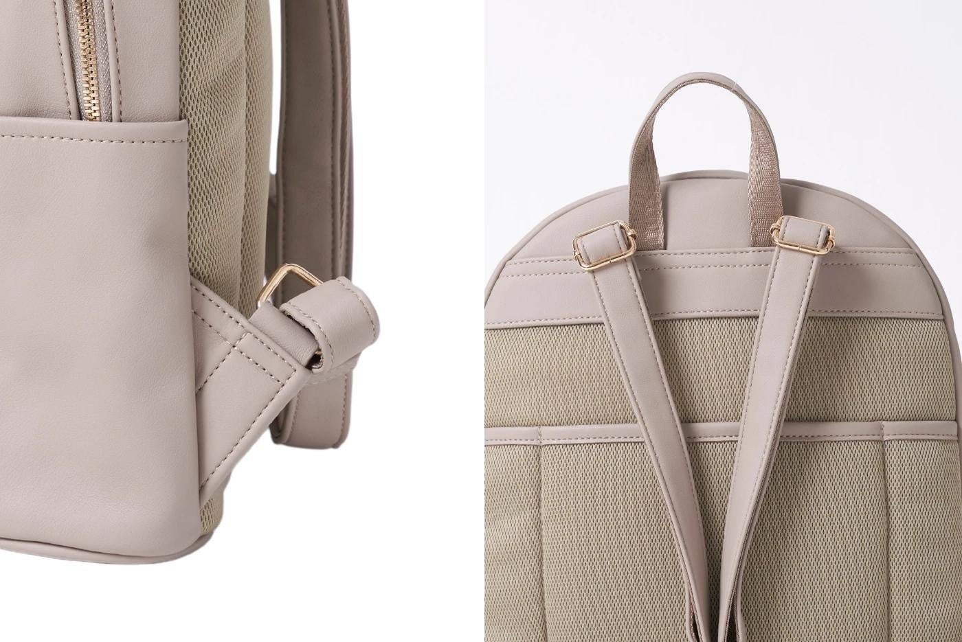 大事な仕事道具であるPCも入るように、耐衝撃性、防水機能のあるクッションもあり充電器や細かい小物も入れられるような複数ポケット、ペットボトルを入れる個所もあります。更に、歩きながらスマホをしまえるように、リュックのサイドにはポケットを。また、フリーランスやノマドの方は旅に行く機会も多いのではと思い、スーツケースに引っ掛けられるところもついています。これだけ多機能なのに、見た目はコンパクトで女性向けの高級ブランドのリュックのような質感とサイズ感を実現するために、何度も修正を繰り返しました。
