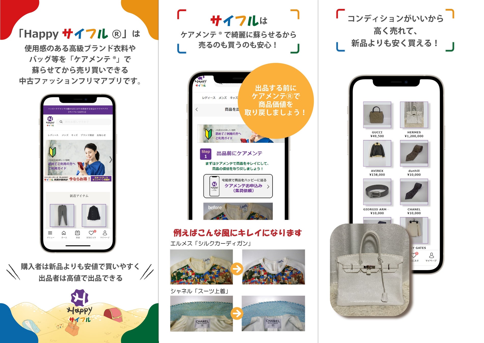 中古ファッションフリマでお小遣い稼ぎ!「Happyサイフル®」は、使用感のある高級ブランド衣料やバッグ等を「ケアメンテ®」で蘇らせてから個人間で売買できる新しいフリマサービスです。