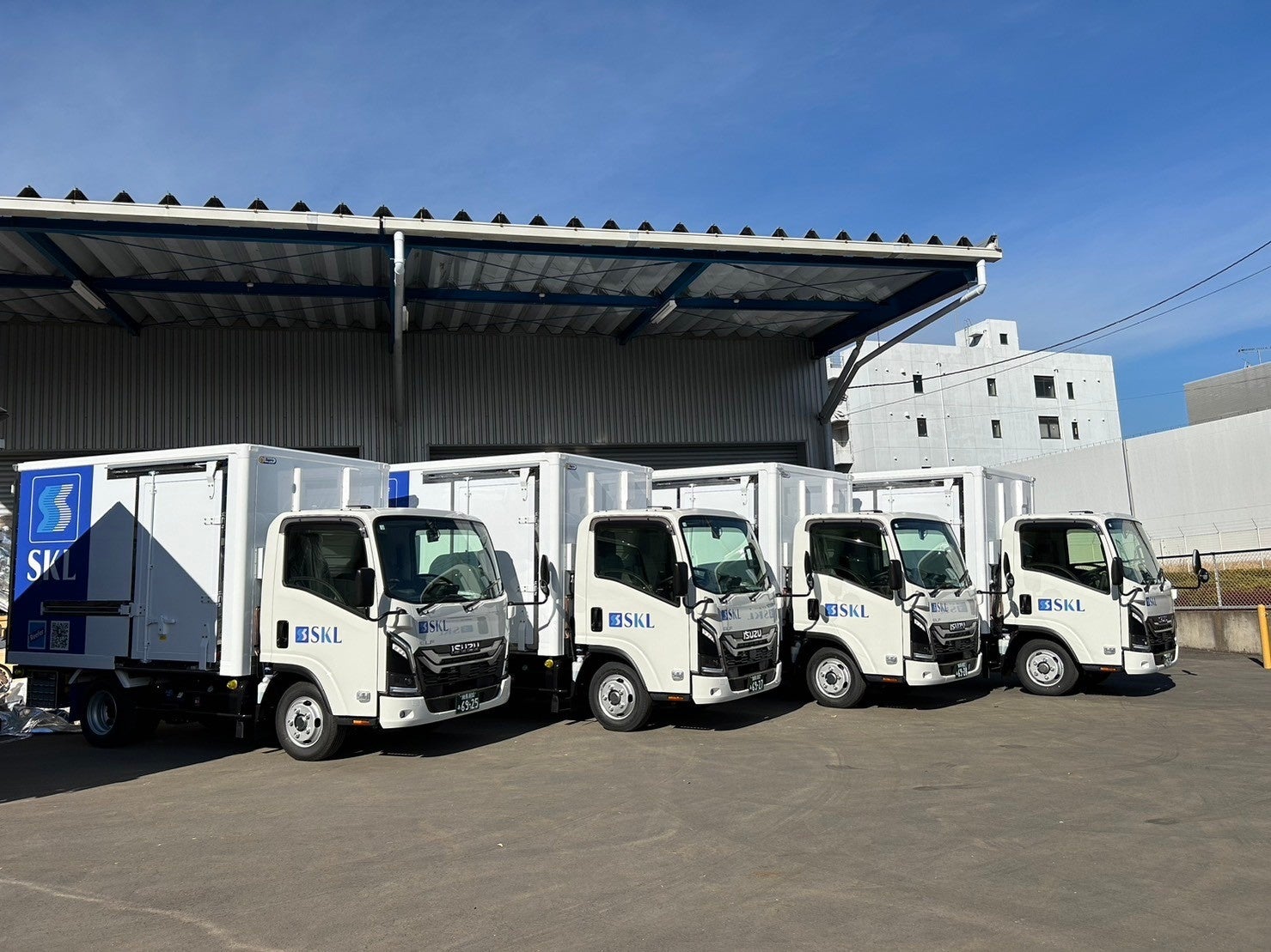 SKLが保有する配送車両は、すべてが「リーファー車」です。リーファー車は、庫内の温度を一定に保ちながら走行できる冷蔵機能付きトラックで、特に夏場の高温期でも温度管理が徹底されるため、お客様からは高い評価をいただいております。