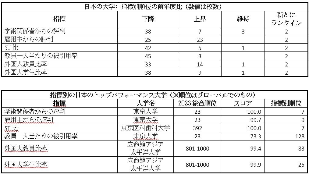 【日本の大学: 指標別順位の前年度比(数値は大学数)/指標別の日本のトップパフォーマンス大学(※順位はグローバルでのもの)】