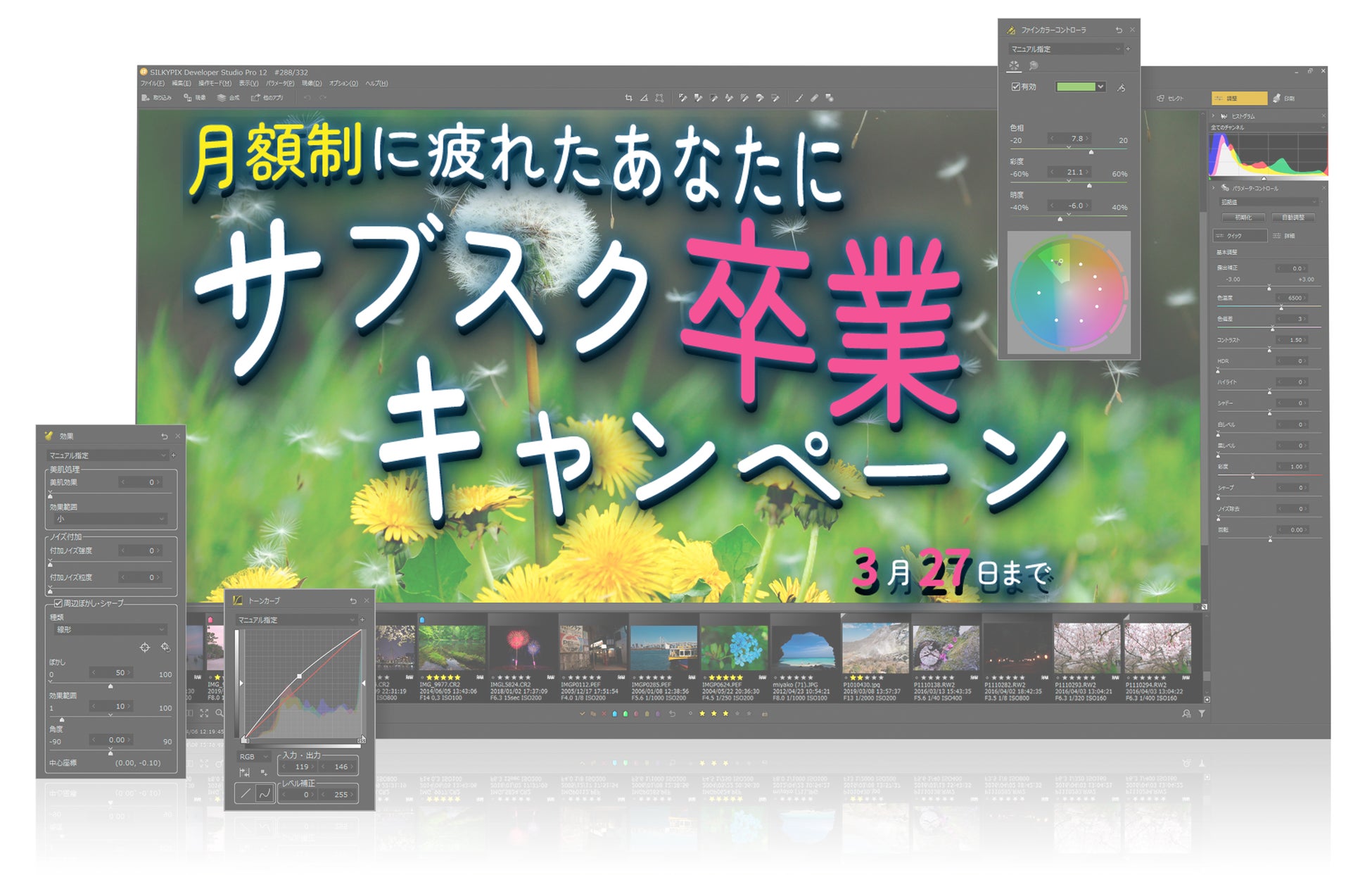 アドワー株式会社(所在地:東京都千代田区 代表取締役社長:天野 光善)は、RAW現像ソフト『SILKYPIX Developer Studio Pro12』を特別価格で提供する『サブスク卒業キャンペーン』に、2025年3月12日よりJPEG写真編集ソフト『SILKYPIX JPEG Photography 12』を新たに追加いたします。本キャンペーンは、近年のサブスクリプション型サービスにおける価格変動や、使用しない期間でも支払いが発生することへの不満を抱えるお客様に向けて、買い切り型で安心してご利用いただける『SILKYPIXシリーズ』を、さらにお求めやすい価格で提供するものです。2025年3月27日までの期間限定で購入いただくことが可能です。