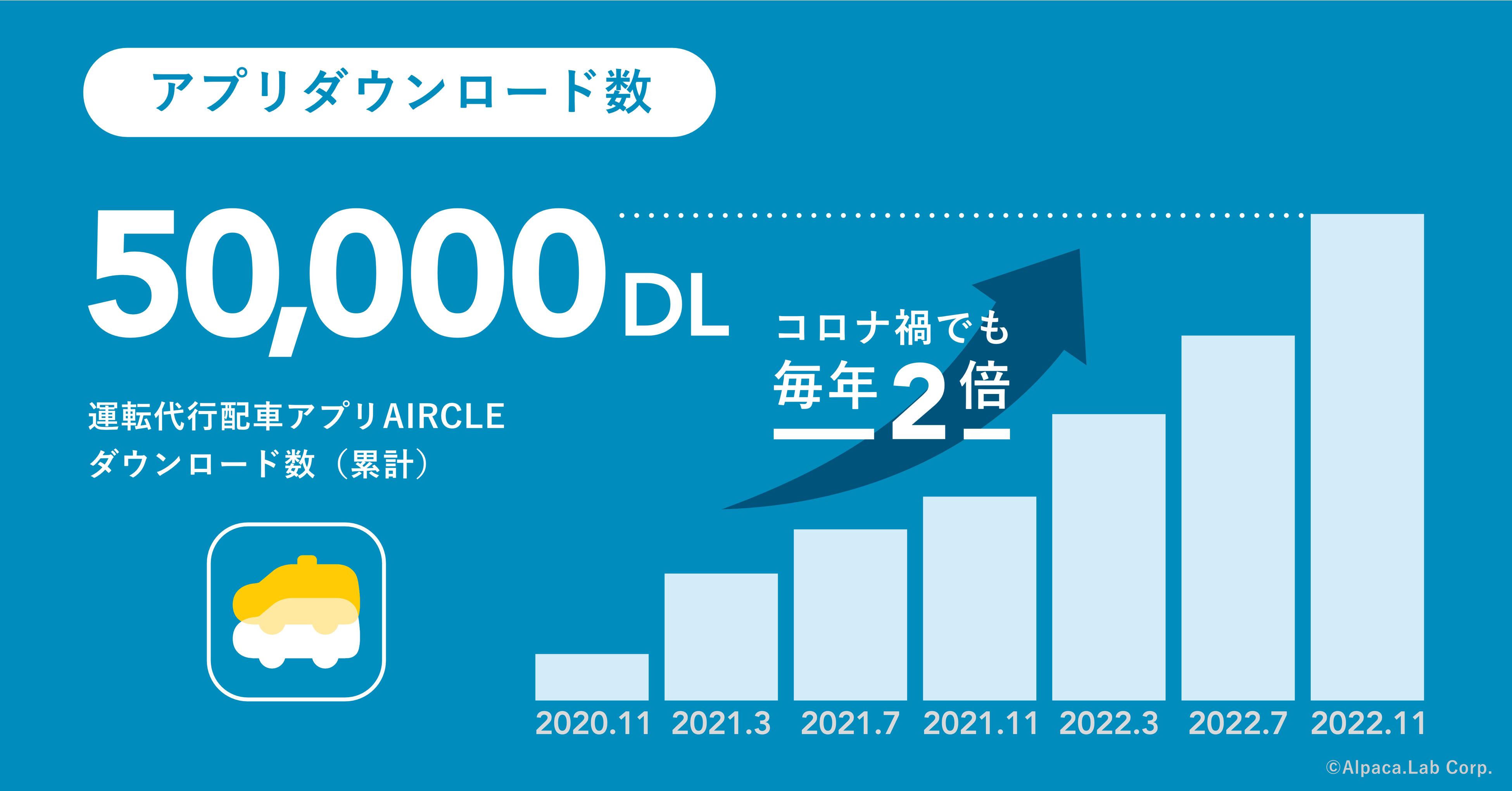 株式会社Alpaca.Lab(所在地:沖縄県中城村、代表取締役:棚原生磨、以下当社)が沖縄県と福岡県で展開する「運転代行すぐ来る、エアクル」でお馴染みの運転代行配車アプリ「AIRCLE(エアクル)」は、2020年8月のサービス開始より累計5万ダウンロード突破しました。この2年間でお客様の利便性と運転代行産業の発展と効率化を後押ししてきた成長の過程をまとめました。