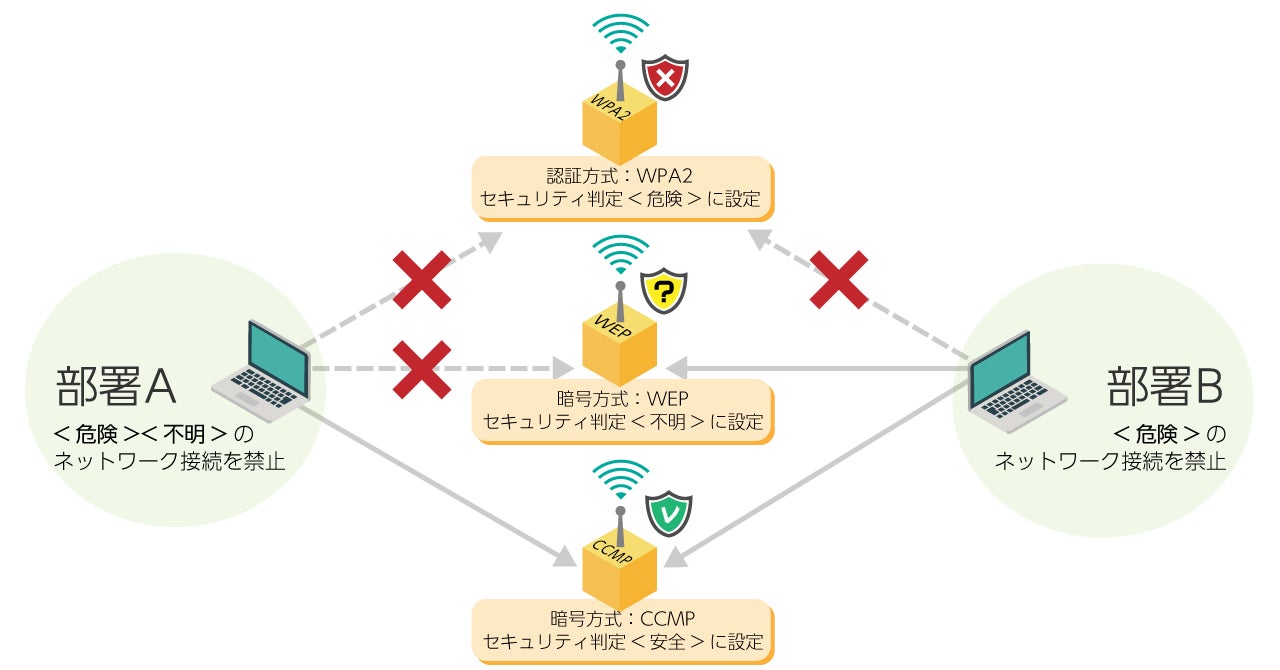 例えば、WPA2、WEP、CCMPという認証・暗号方式をセキュリティ判定“危険”、“不明”、“安全”に分けて管理が可能になりました(図1)。機密データを保持する部署AのPCには接続可能な方式を“安全”だけに限定することで、フリーWi-Fiなどでの情報漏洩を防ぐことが容易になりました。また、部署BのPCには “危険”の方式以外は接続を許可する、というように環境に合わせた使い方ができます。このように、セキュリティリスクの高いネットワークへの接続を制御することで、不正アクセスや情報漏洩を未然に防ぎます。