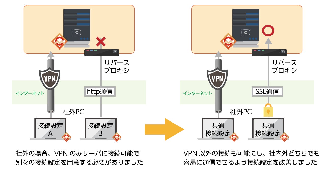 MCoreは従来のVPN経由での業務用PC情報収集だけでなく、インターネット接続*¹での業務用PC情報収集にも対応し、社外で勤務する場合も社内と同じレベルのセキュリティを担保できるようになりました。従来、社外からの通信はVPN通信していることが前提でしたが、今回よりSSL通信に対応し、VPNを使用できない環境でも安全に接続することが可能になりました(図2)。さらに、従来は管理サーバに接続するために社内と社外で別々の接続設定を用意する必要がありましたが、社内・社外どちらで勤務する場合でも、共通の接続設定を使用可能になり、利用者に一切意識させることなく管理サーバに接続できるようになりました。これにより勤務場所を問わず、どの業務用PCでも定期的に最新情報を収集することができるようになりました。