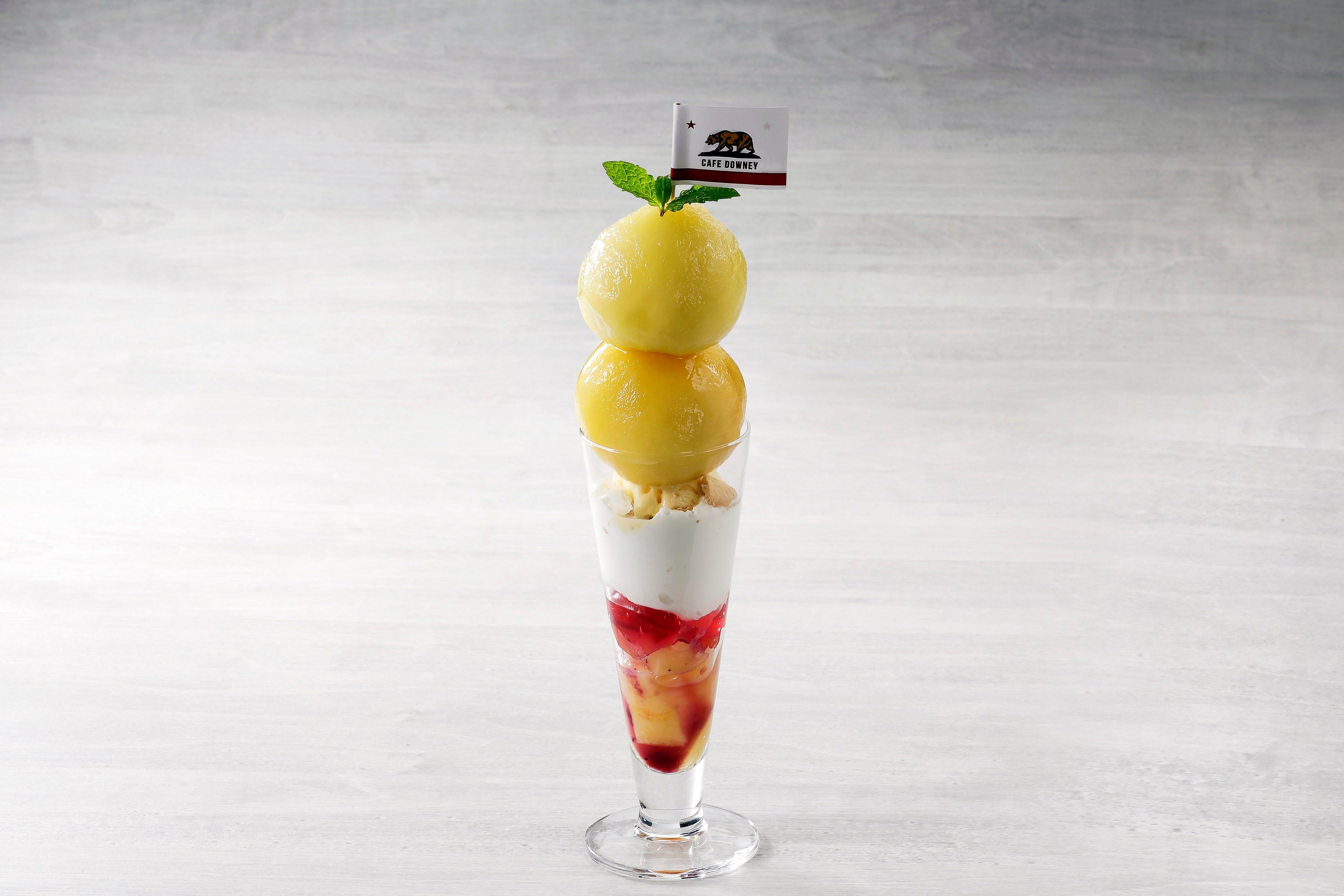 毎年大人気!ダウニーの夏の定番。丸ごと桃を2個も使用した、期間限定の贅沢なパフェです。