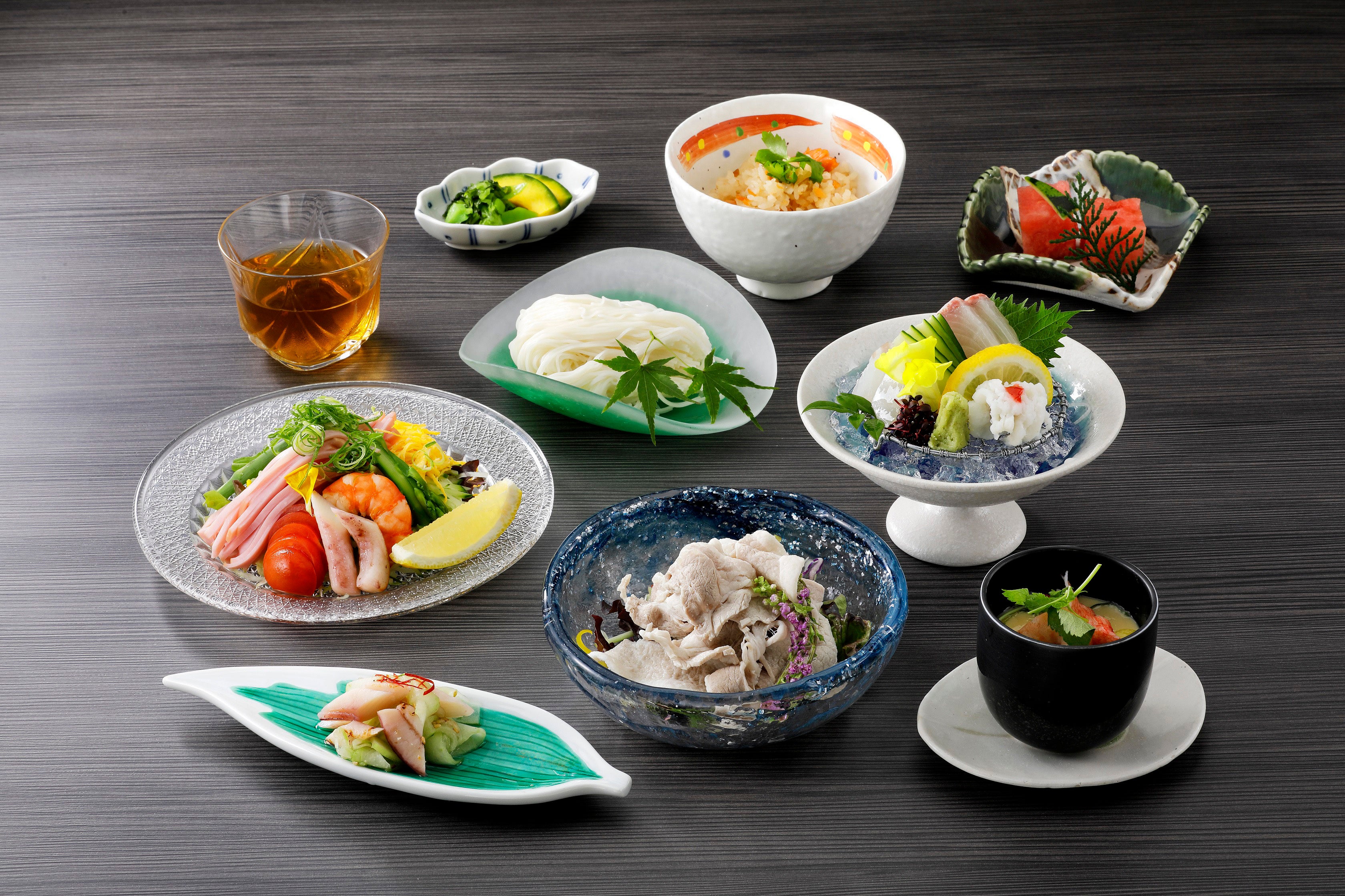 能登豚の冷しゃぶ、冷やしそうめん、お造り、賀太きゅうりの酢の物など夏らしさを味わっていただけるメニューです。