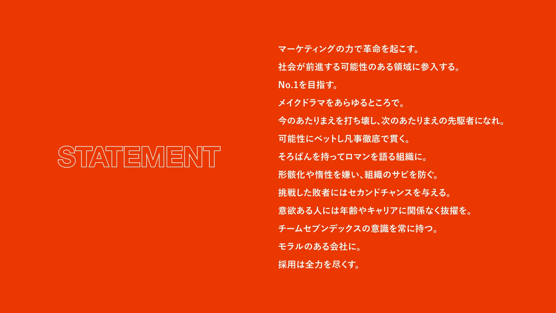 パーパス・ミッション・ビジョンに到達するためには、日常的に全メンバーの水準を合わせる必要があるとセブンデックスは考えています。ビジョンである「時代を席巻する会社」とは、どのような会社なのか? セブンデックスは、この問いに対する答えを13個のステートメントとして定義しました。