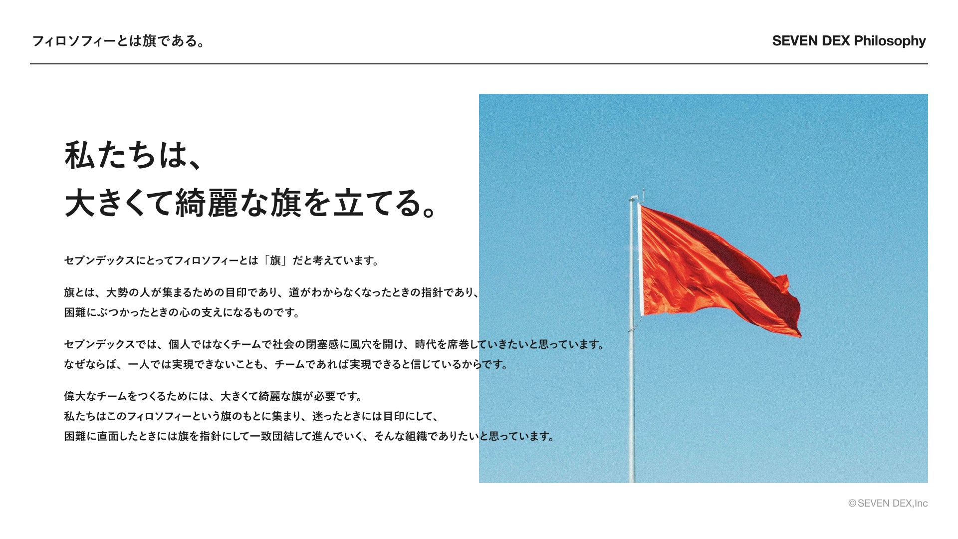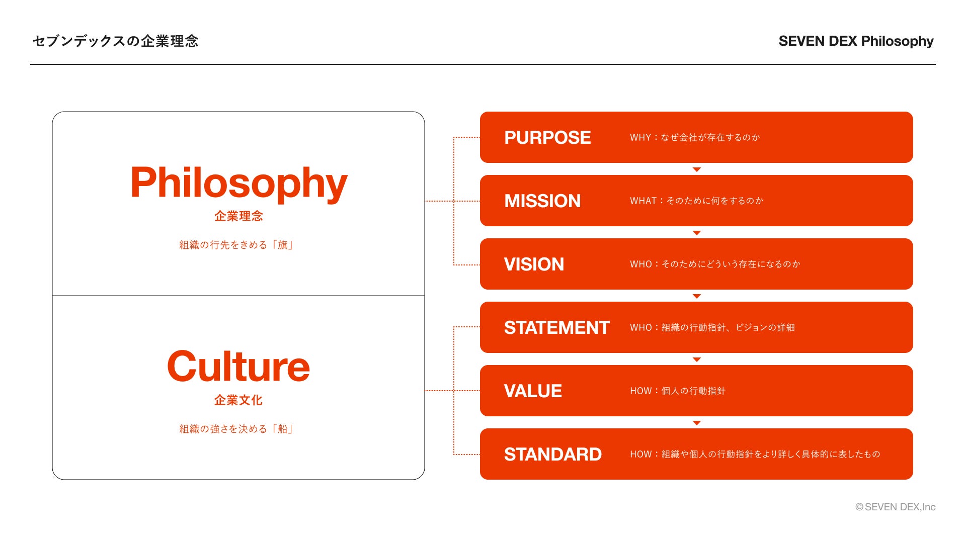 株式会社セブンデックス(本社:東京都、代表取締役:中村伸啓、堀田信治)は、2024年10月に7年目を迎え、2025年3月、新たな企業理念の策定を発表しました。本企業理念の核となるのは、セブンデックス独自の「企業文化」の定義とその言語化です。「ステートメント」「バリュー」「スタンダード」を企業文化の柱として位置づけ、これを源泉に、パーパス・ミッション・ビジョンの実現に向けた行動を推進してまいります。