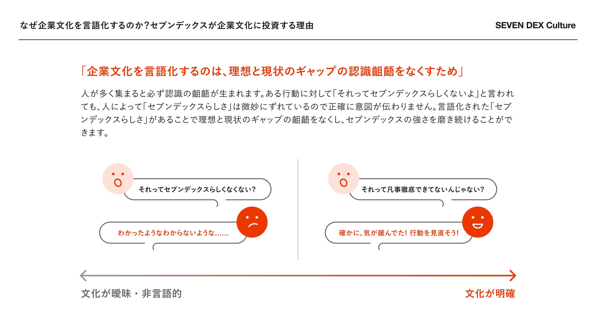セブンデックスが企業文化を言語化する理由は、理想と現状のギャップによる認識の齟齬をなくすためです。多くのメンバーが集まる中で、「セブンデックスらしさ」は個々の解釈で微妙に異なる場合があります。これを言語化することで、全員が同じ基準を共有し、理想に向けて一致団結して行動できるようになります。言語化された企業文化をもとに、セブンデックスは「強さ」を磨き続けていきます。